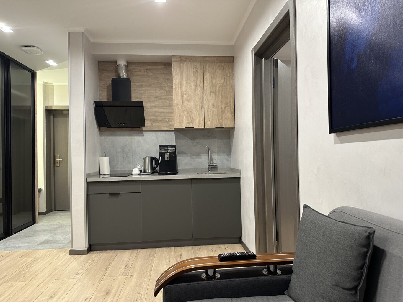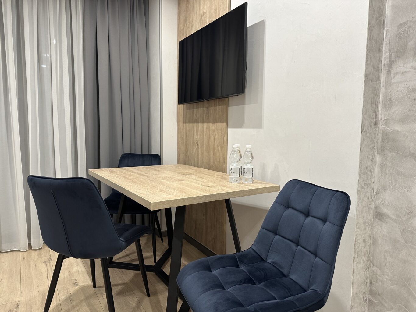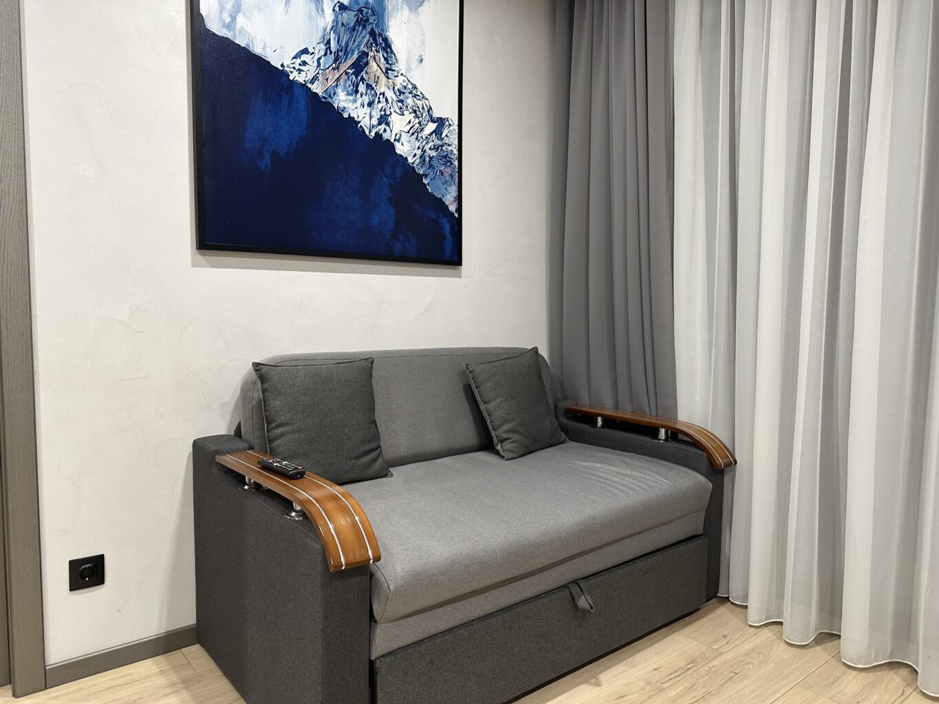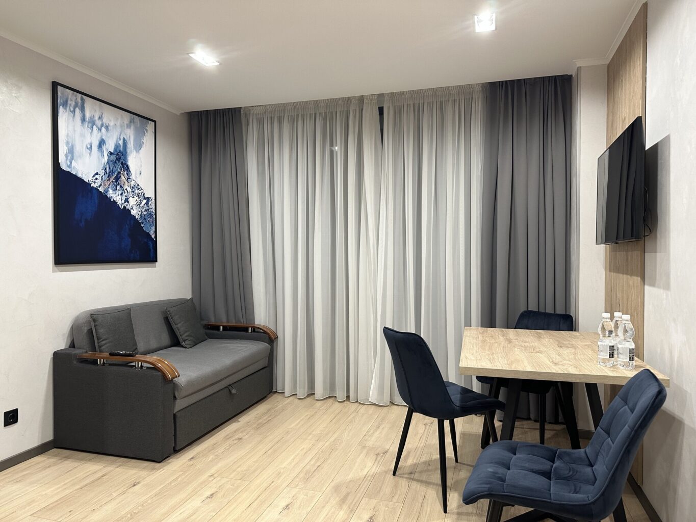 Ідеальні апартаменти під інвестицію чи власне проживання. Простора кухня-вітальня з розкладним диваном, обіднім столом на 4 персони, вмонтованою зоною кухні, яка має весь набір посуду та побутової техніки провідних світових виробників для