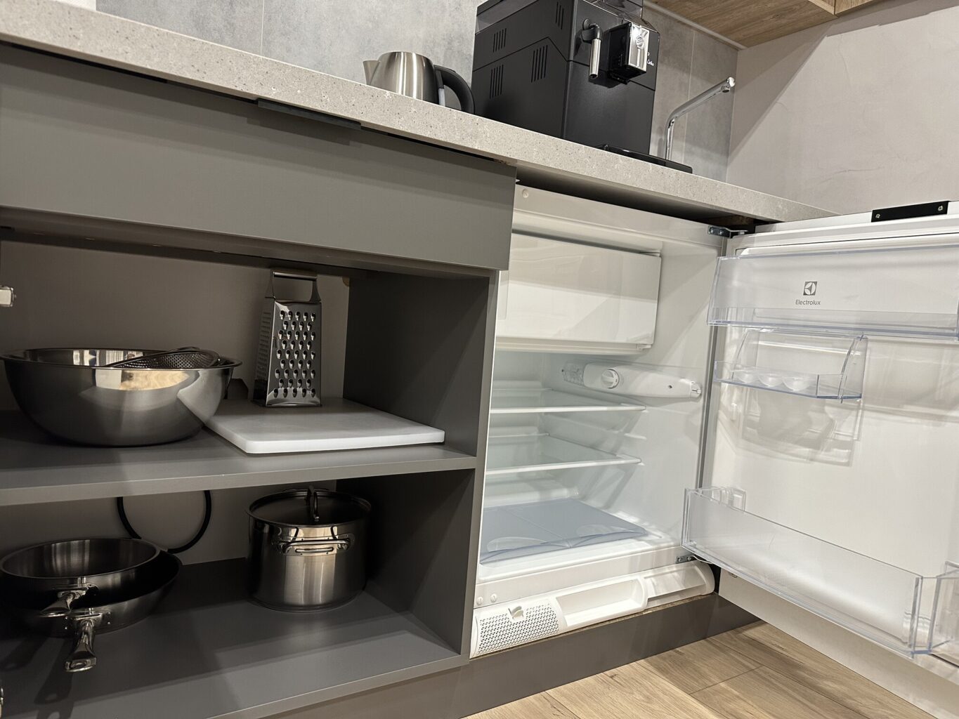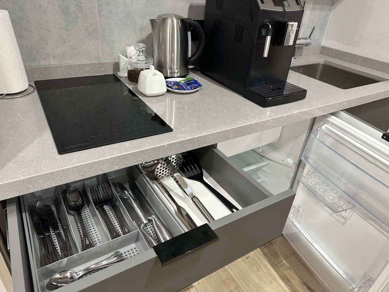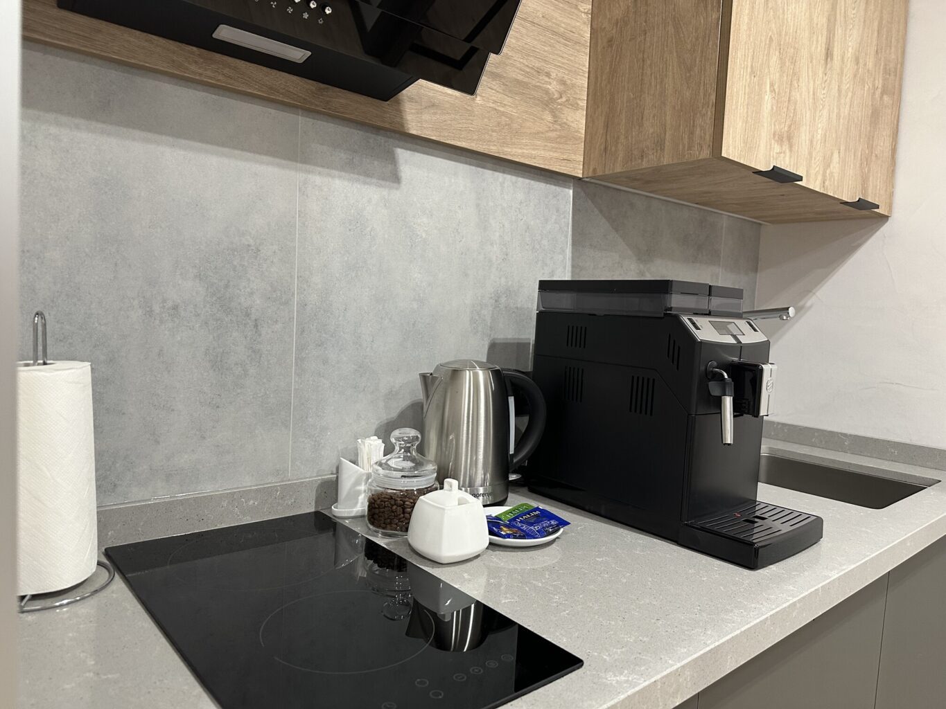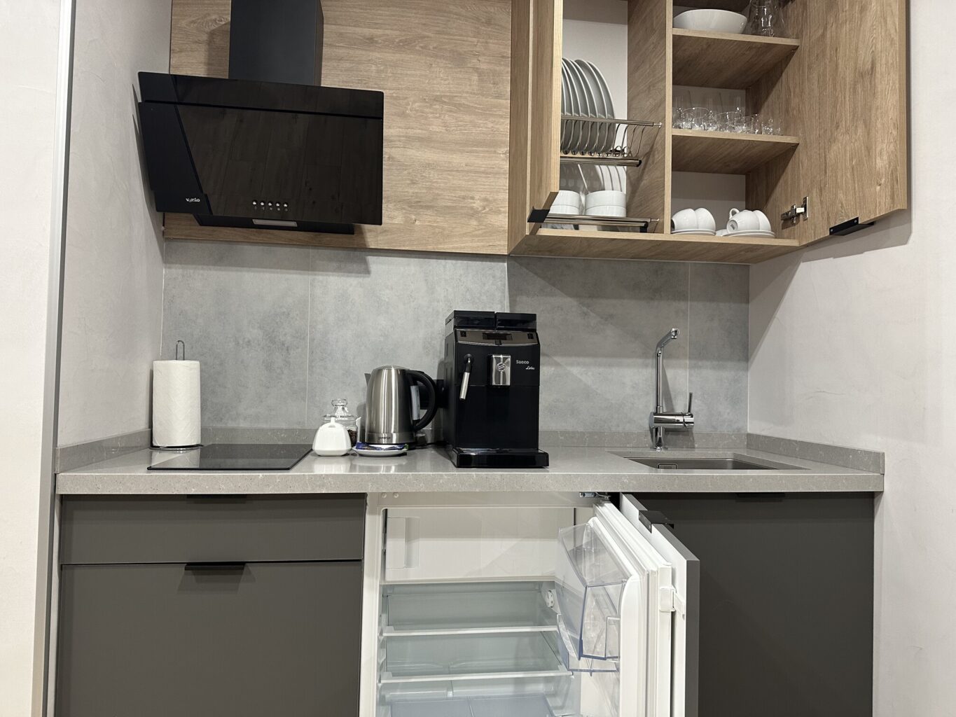 Ідеальні апартаменти під інвестицію чи власне проживання. Простора кухня-вітальня з розкладним диваном, обіднім столом на 4 персони, вмонтованою зоною кухні, яка має весь набір посуду та побутової техніки провідних світових виробників для