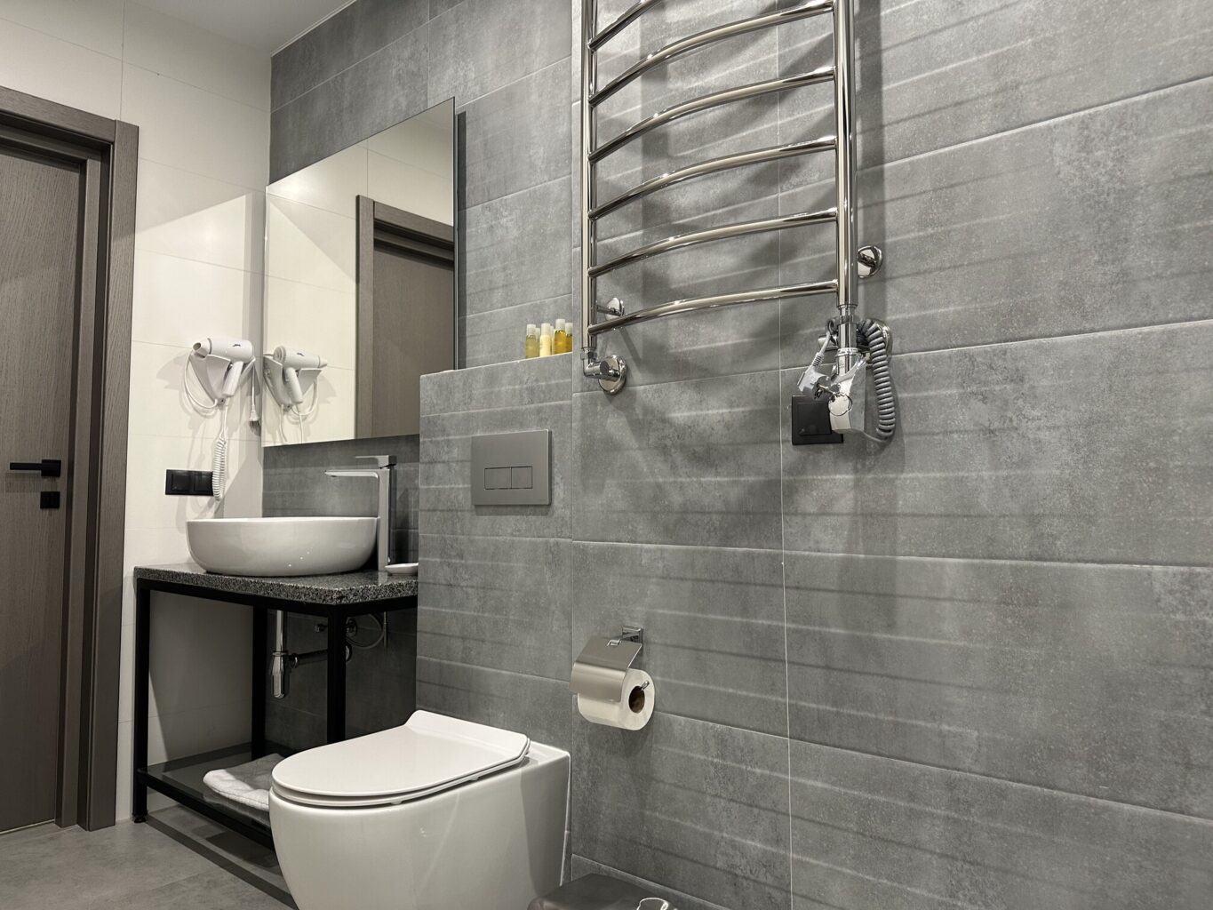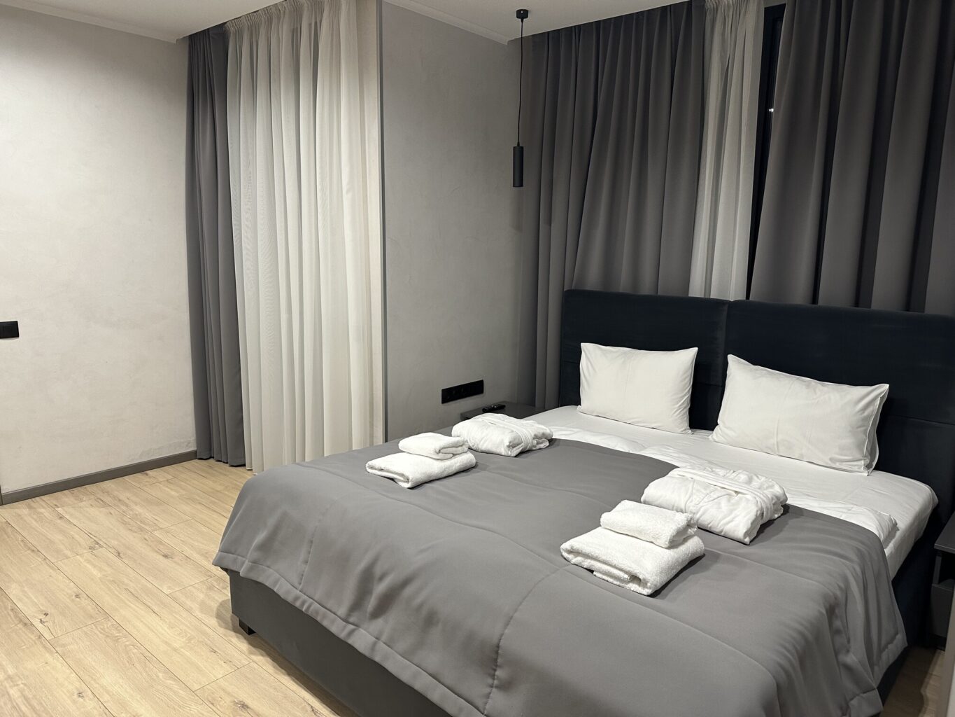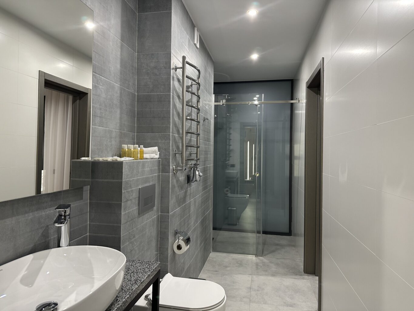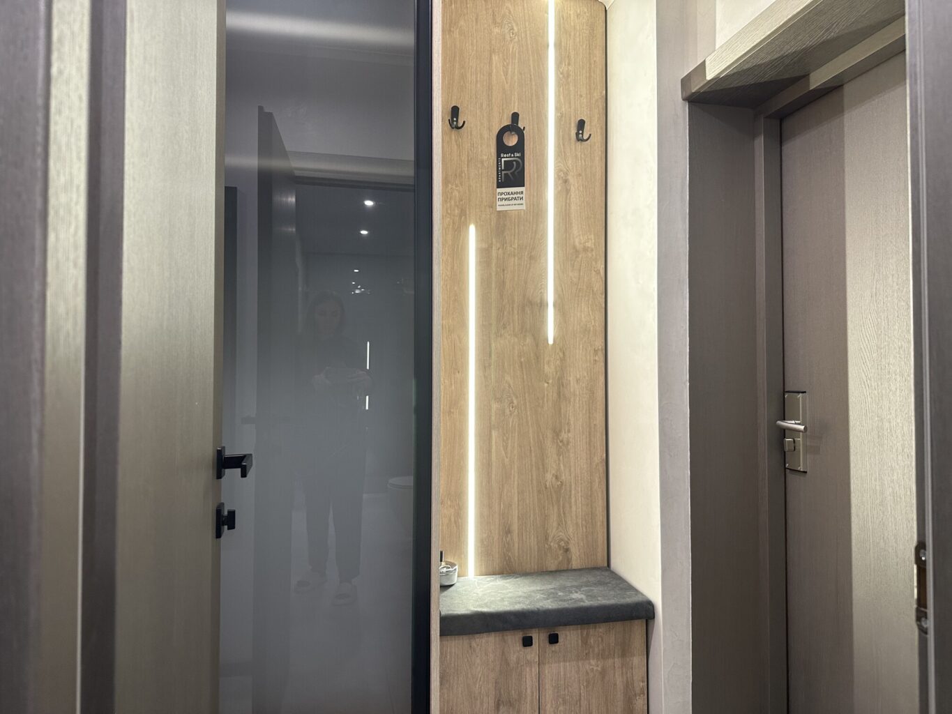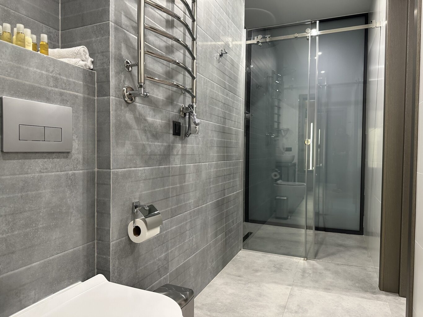 Санвузол має два входи для комфорту, є містка шафа в продуманому до дрібниць коридорі. Простір апартаменту світлий та візуально здається ще більшим за рахунок краєвиду з панорамних вікон.