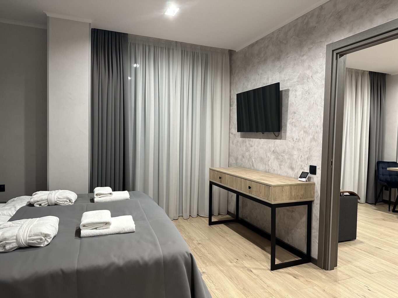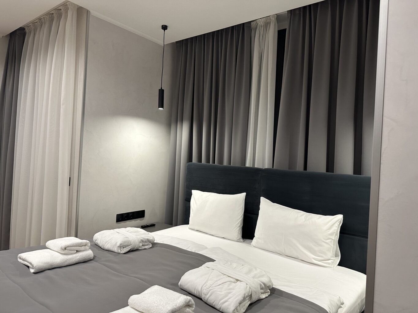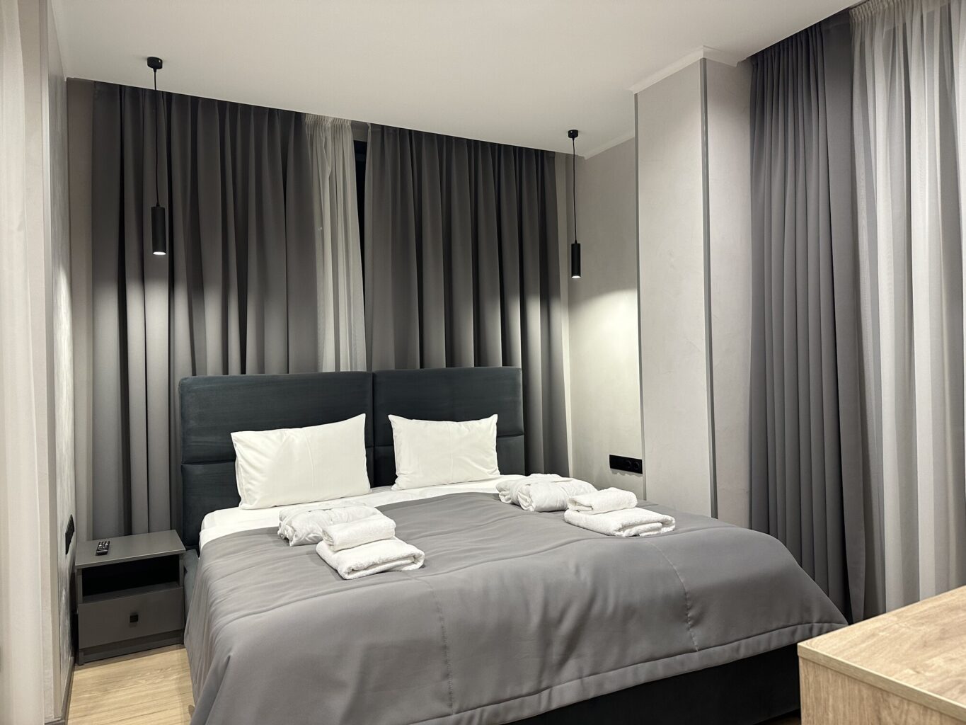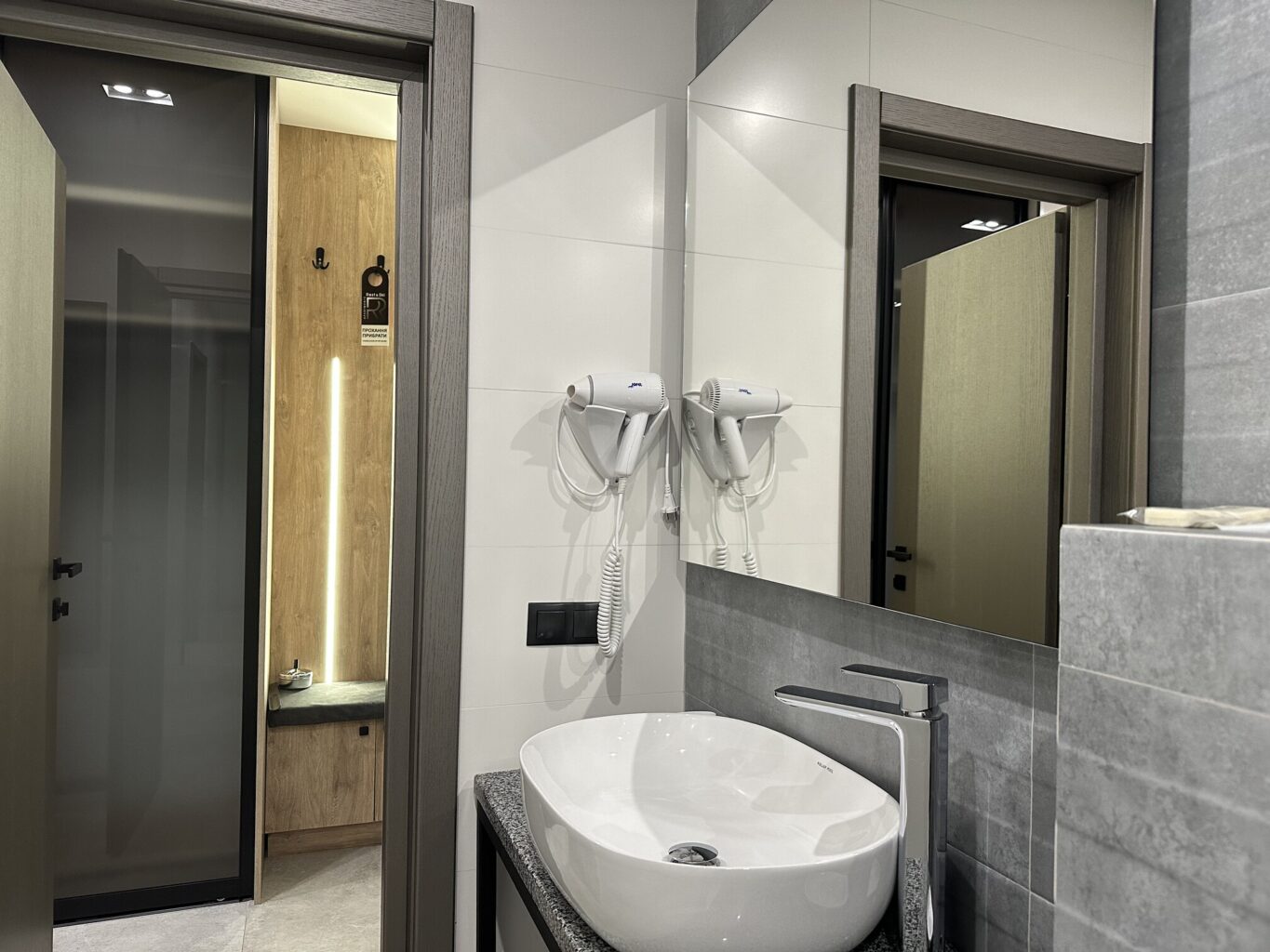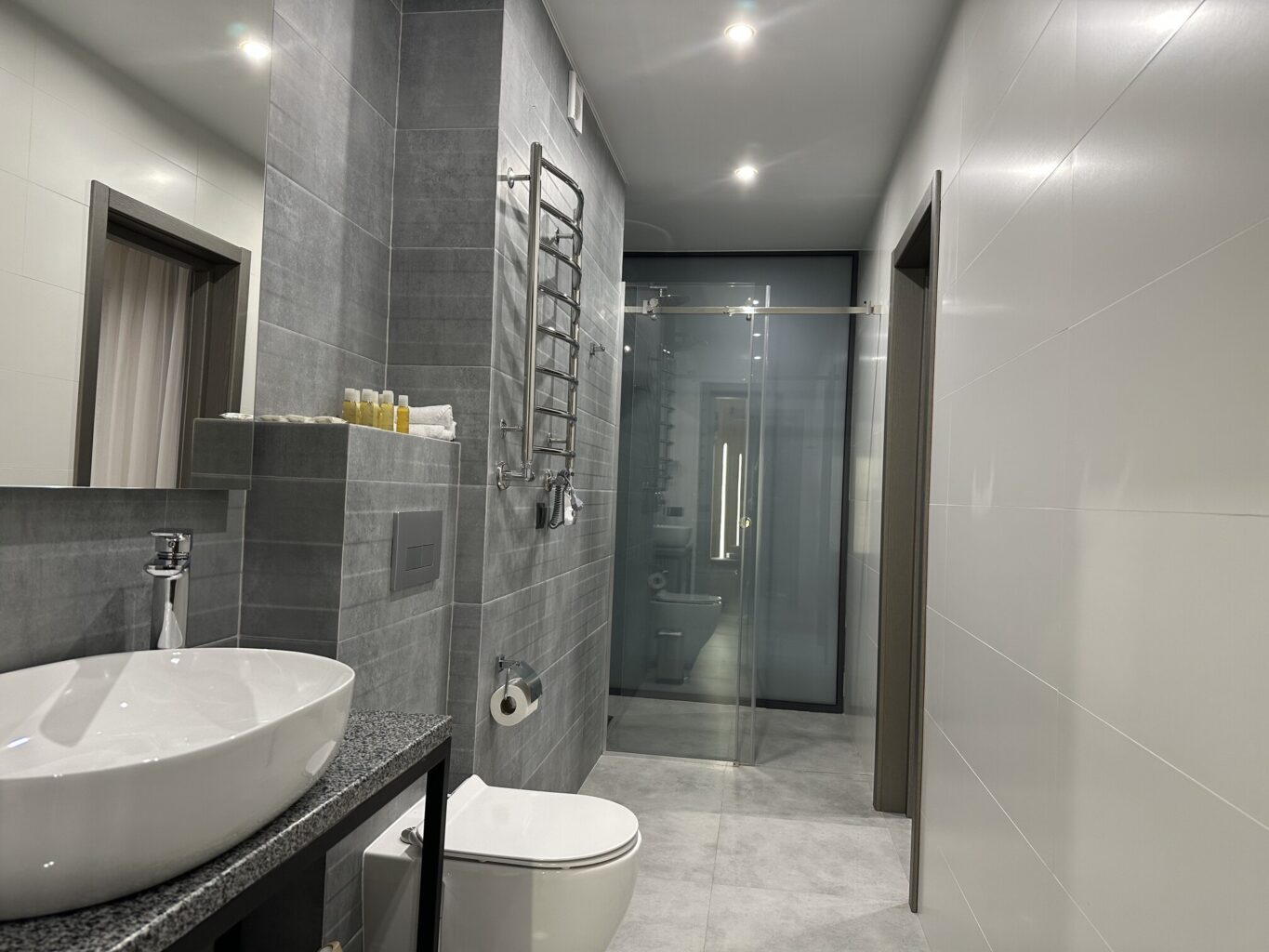 Санвузол має два входи для комфорту, є містка шафа в продуманому до дрібниць коридорі. Простір апартаменту світлий та візуально здається ще більшим за рахунок краєвиду з панорамних вікон.