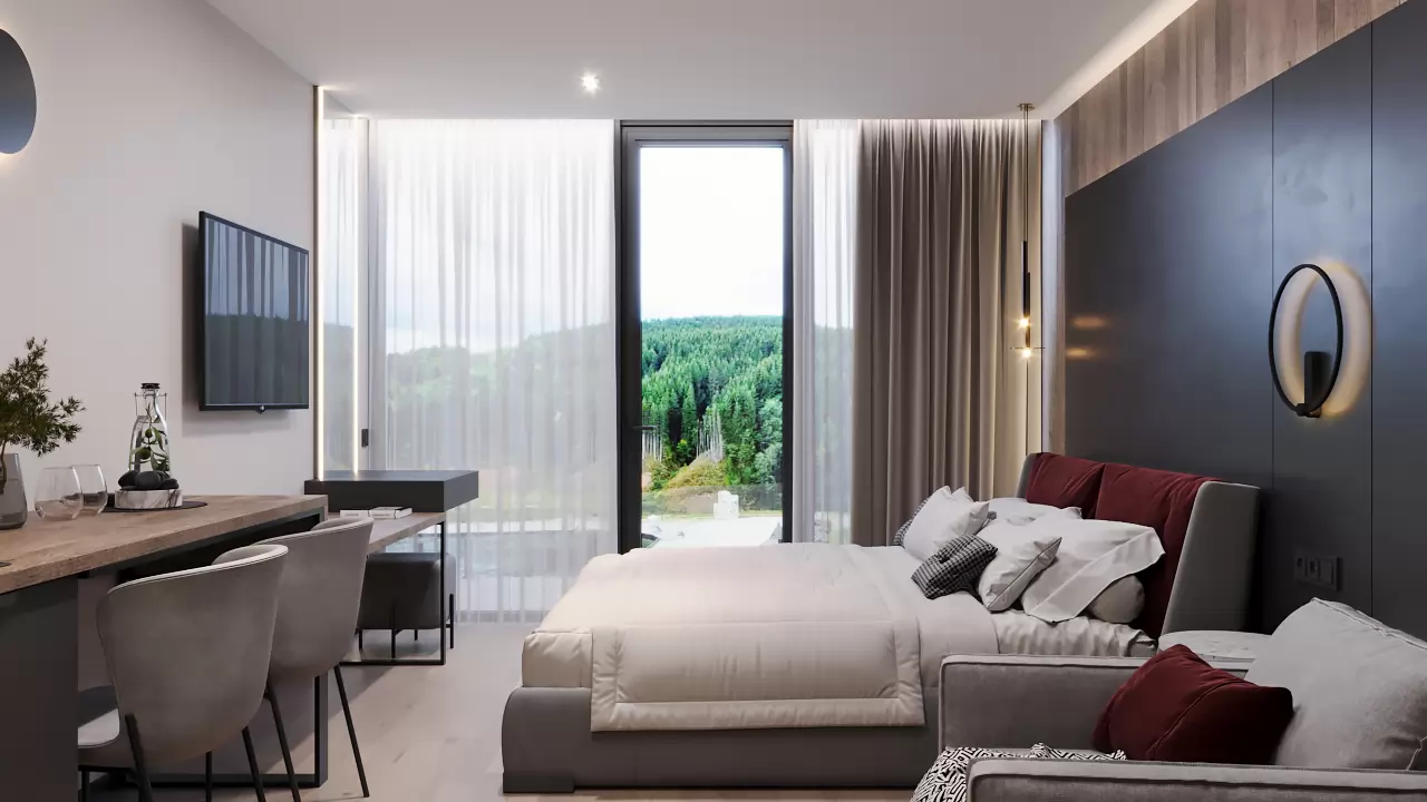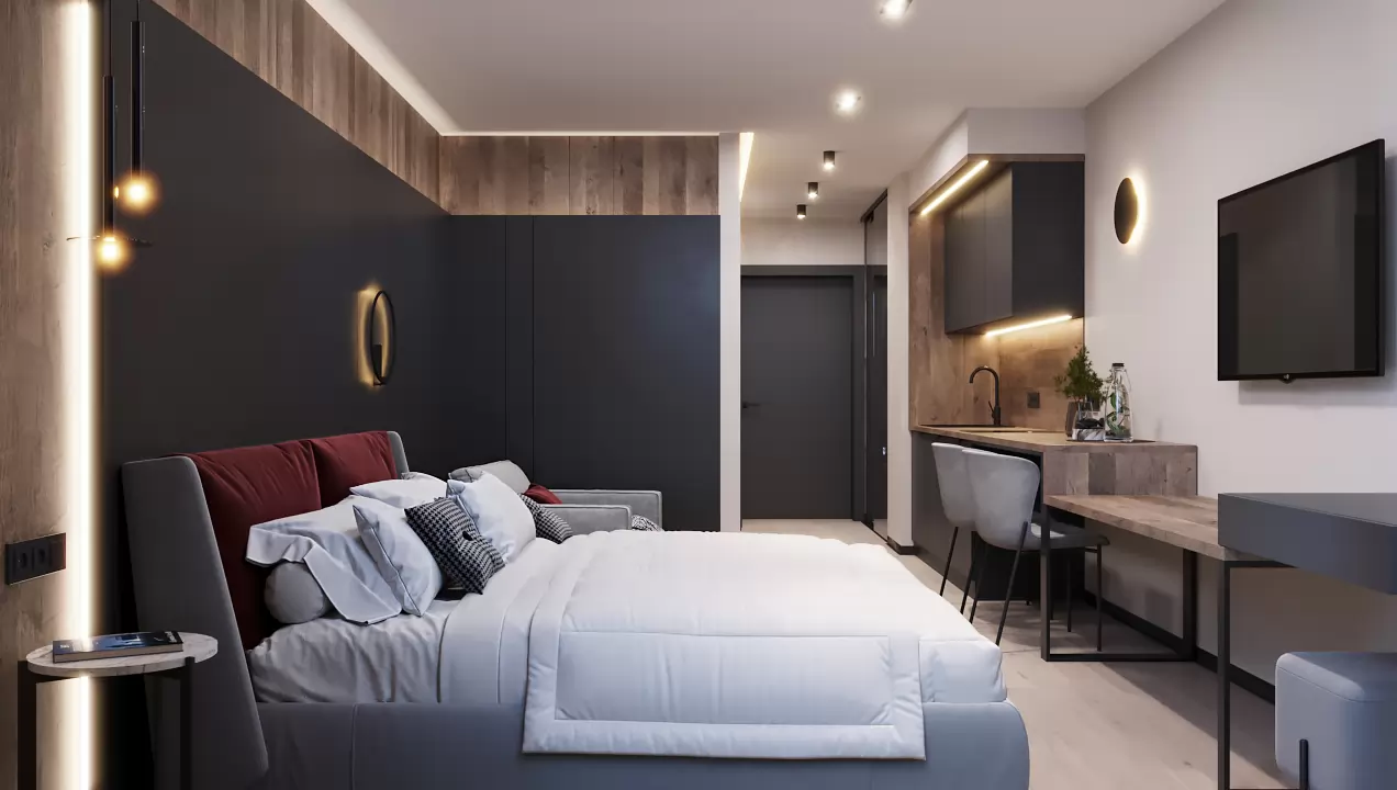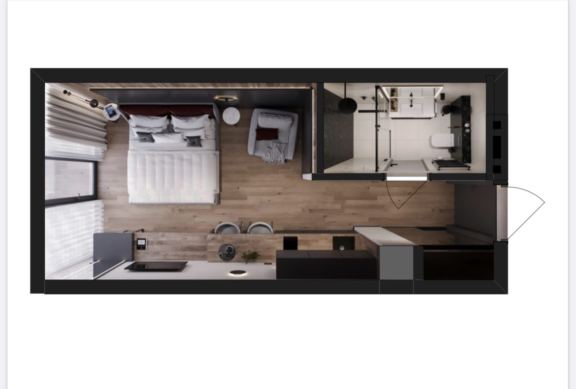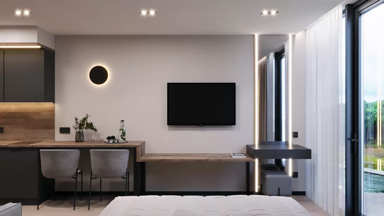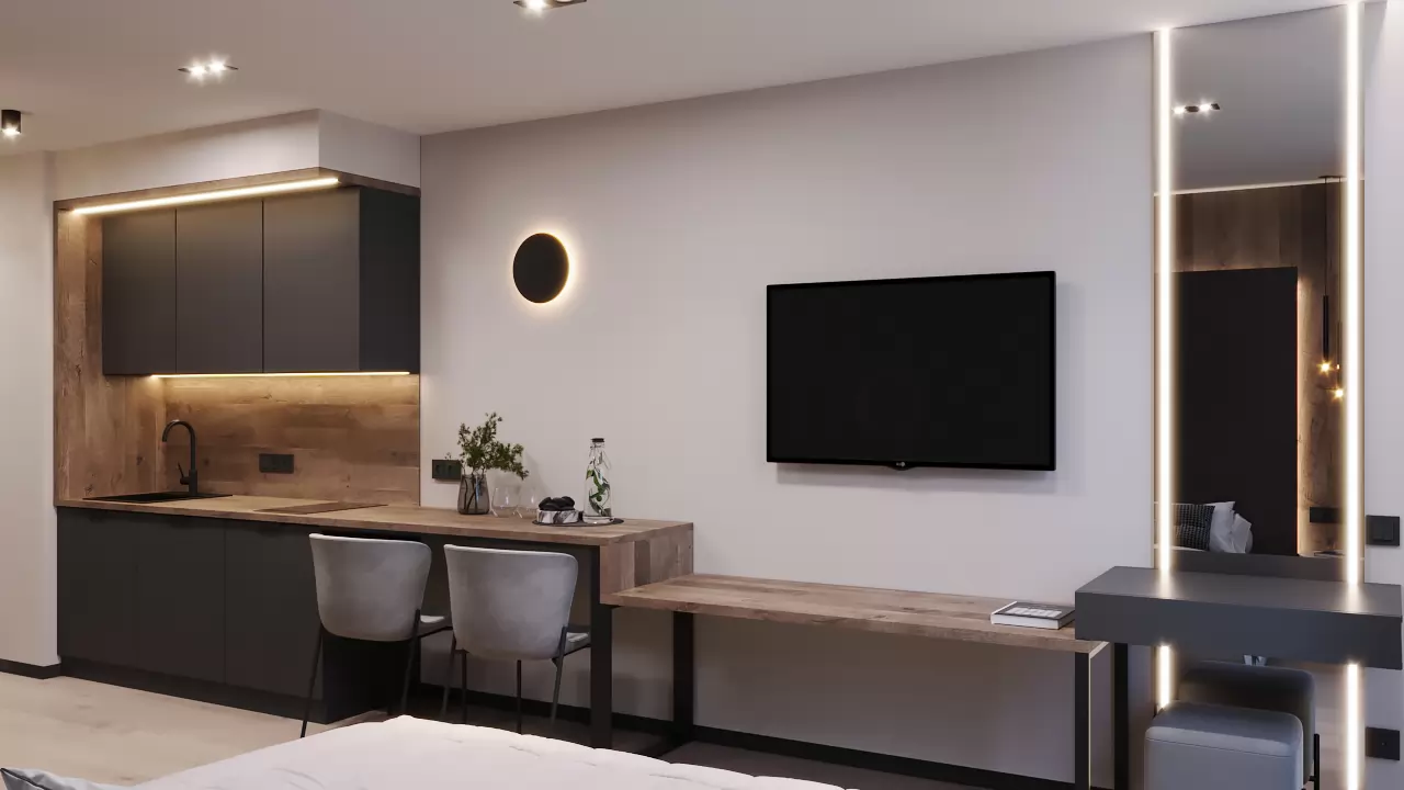 Компактний простір, де все продумане до дрібниць задля вашого комфортного життя та відпочинку. Ергономічне рішення кухні та її інтеграція в простір дозволяє сприймати інтер’єр цілісно, а сучасні рішення органічно розділяють зону відпочинку, де можна встановити диван, кухні, зустрічі з гостями. Особливості цим апартаментам додають панорамні вікна з неймовірним краєвидом.