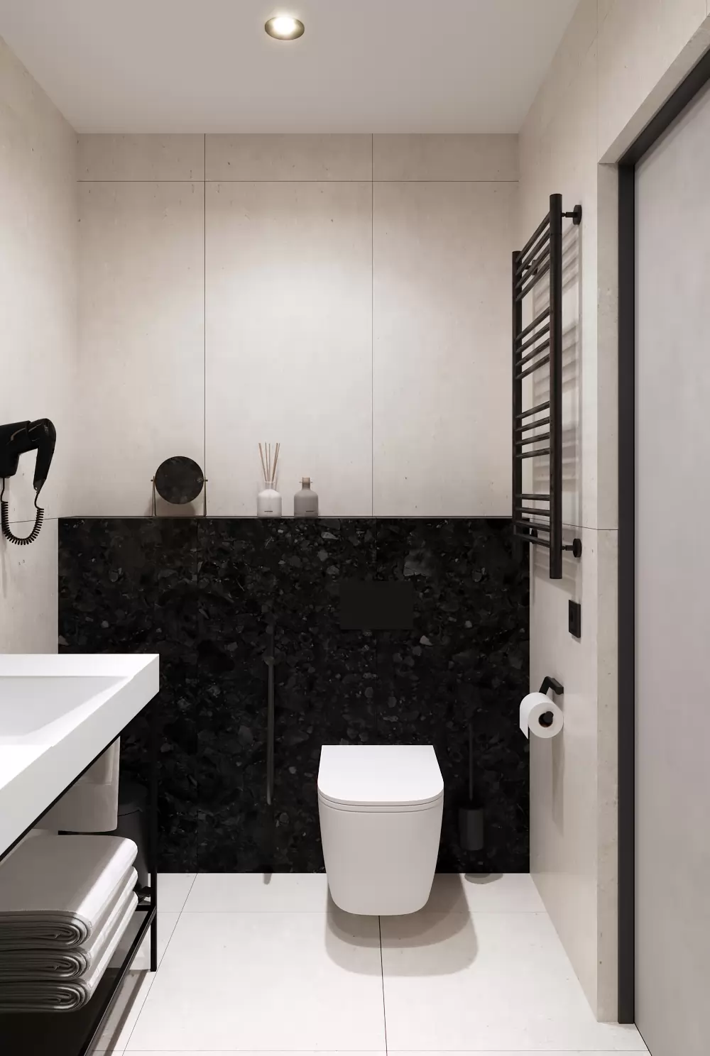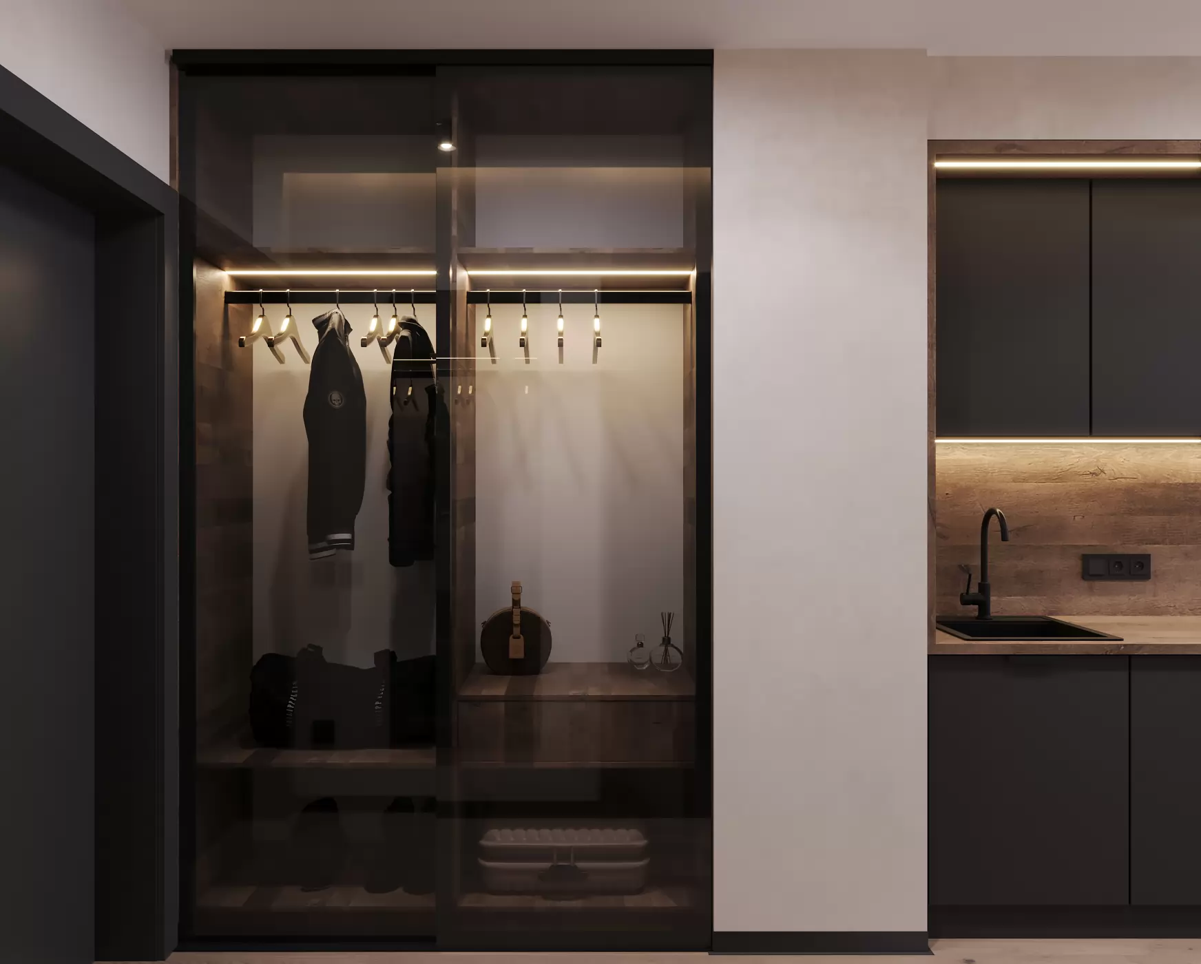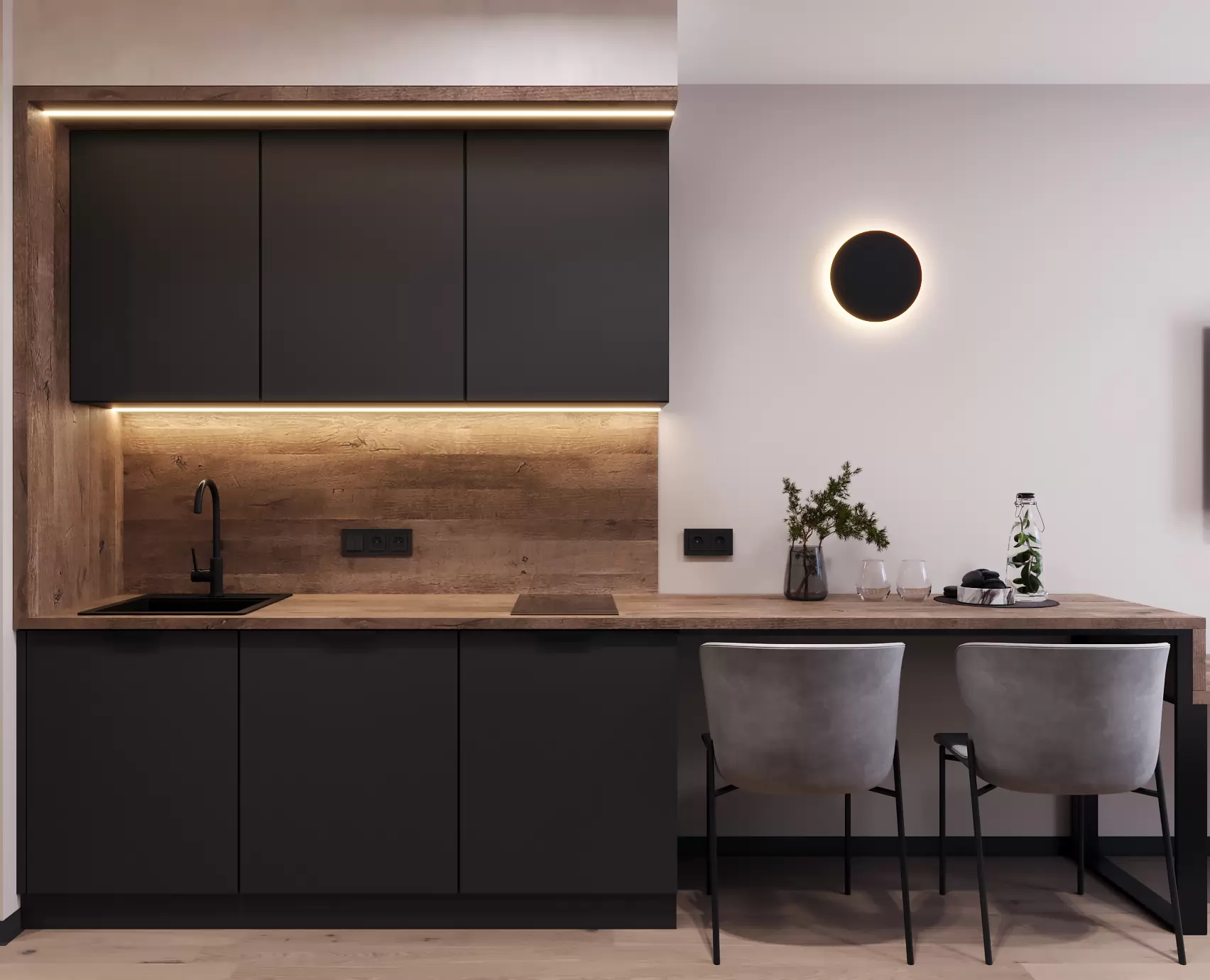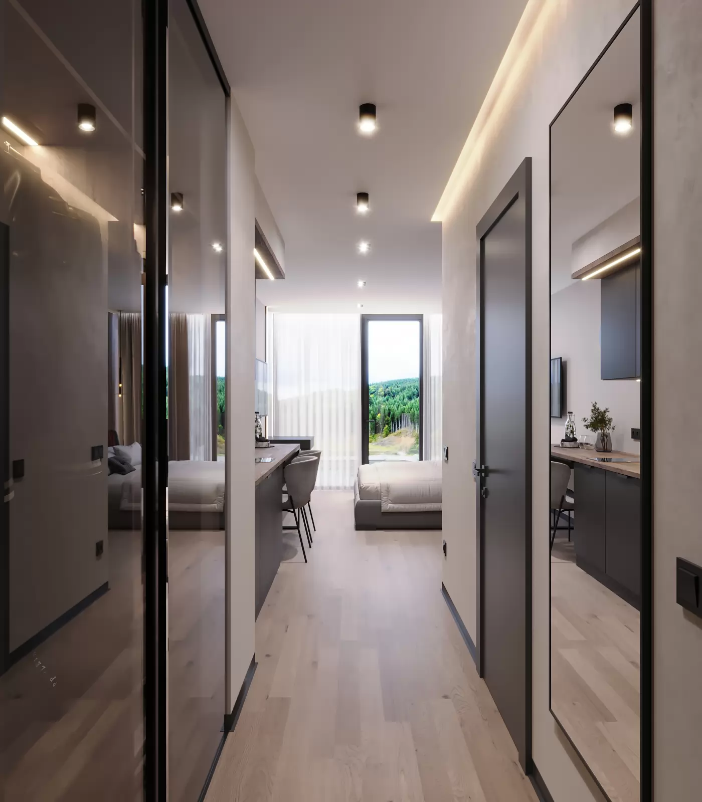 Компактний простір, де все продумане до дрібниць задля вашого комфортного життя та відпочинку. Ергономічне рішення кухні та її інтеграція в простір дозволяє сприймати інтер’єр цілісно, а сучасні рішення органічно розділяють зону відпочинку, де можна встановити диван, кухні, зустрічі з гостями. Особливості цим апартаментам додають панорамні вікна з неймовірним краєвидом.