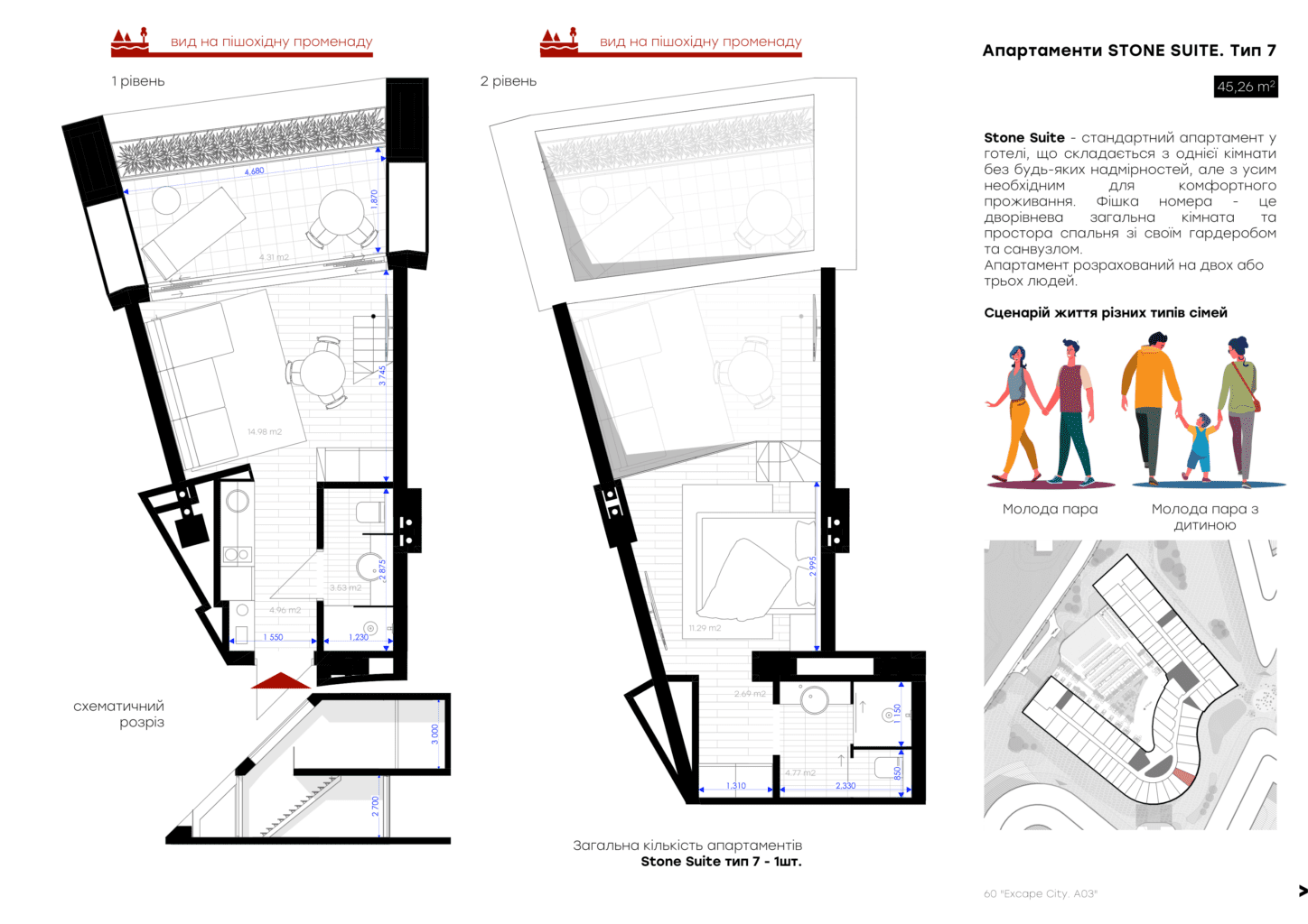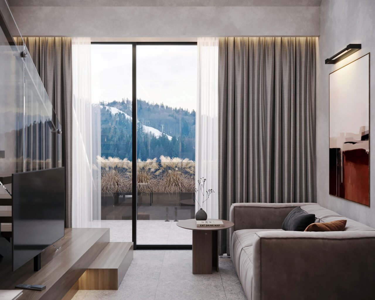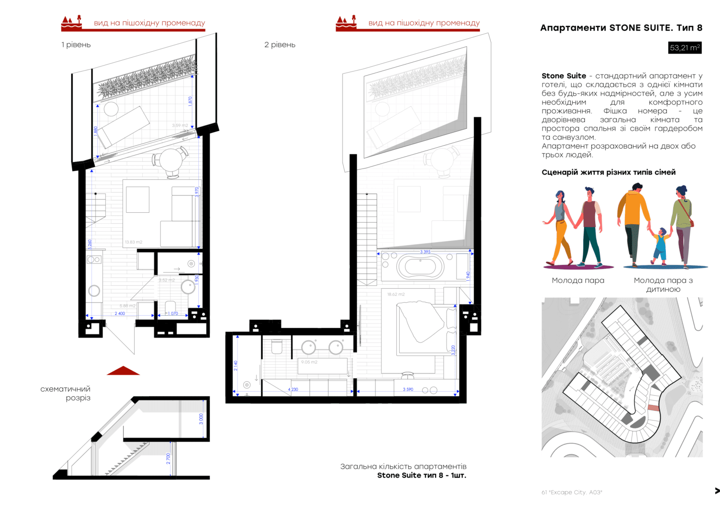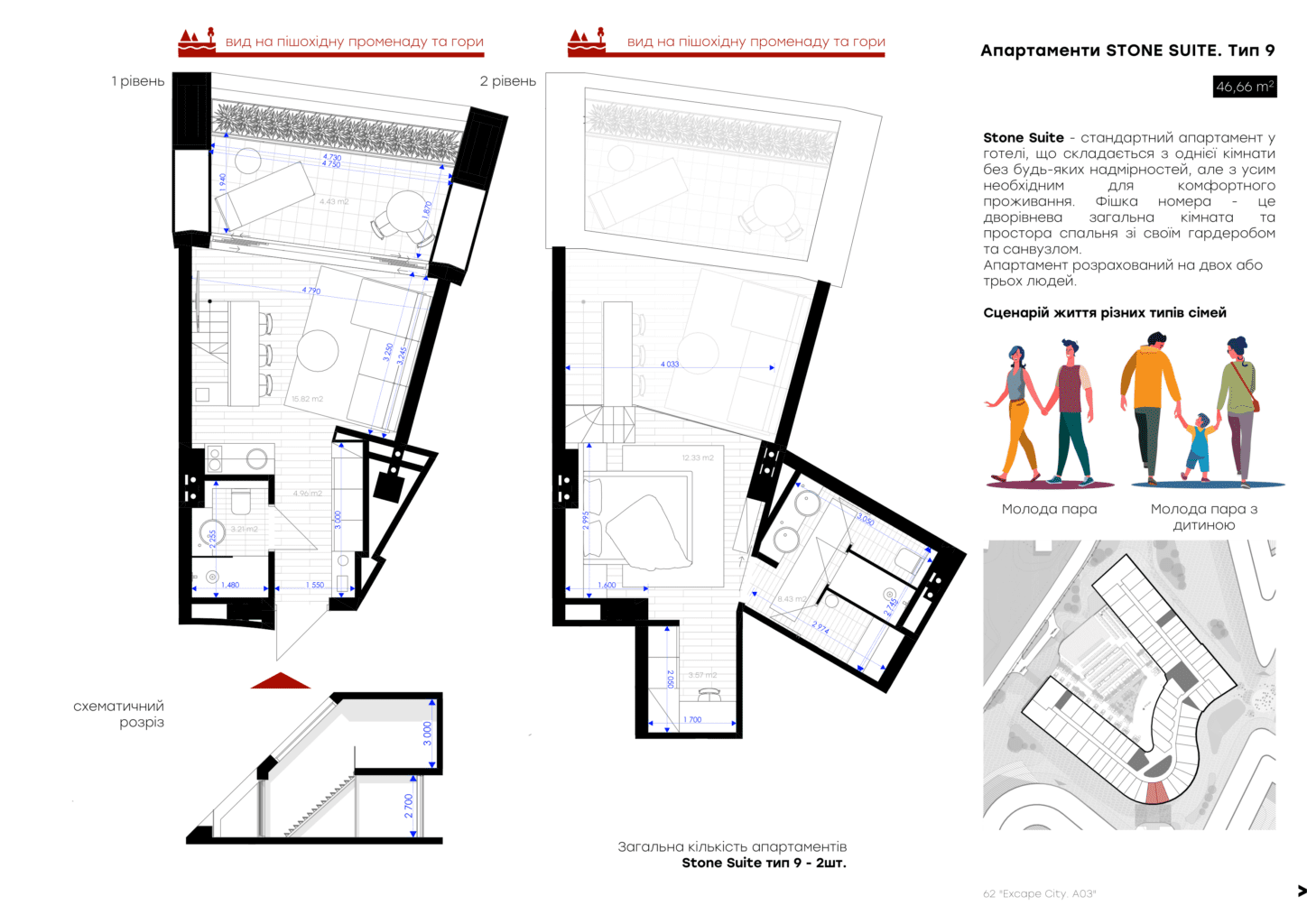 Для вашого комфорту ми створили різні площі обʼєнані єдиною концепцією величного атріума, open space простір з панорамним склом висотою біля 7 м, який об’єднує 2 поверхи апартаменту та створює відчуття польоту та єдності з природою. Найбільш популярне планування серед елітних туристичних курортів преміальної Європи .